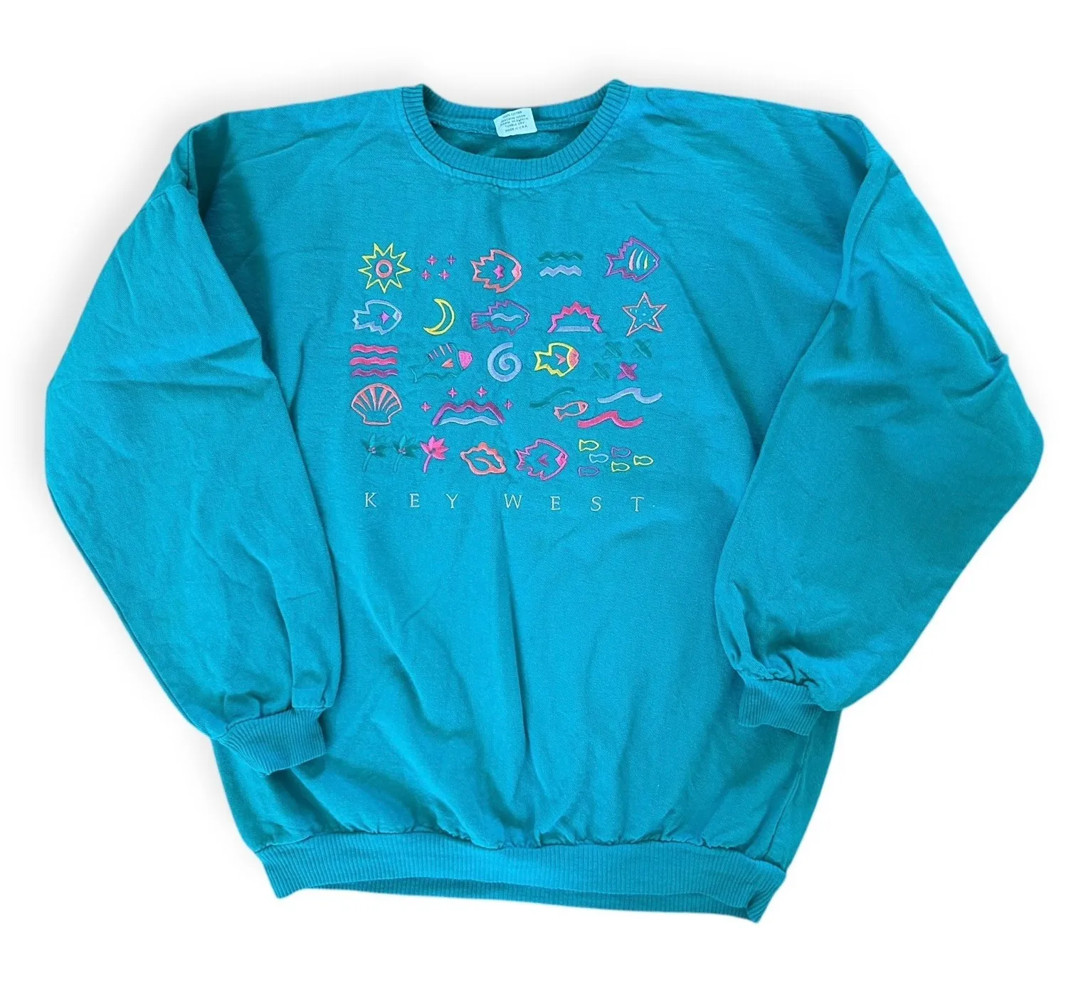 Amazing, vintage bright blue embroidered Key West Crazy Shirts Hawaii 100% cotton sweatshirt. Embroi... Show more