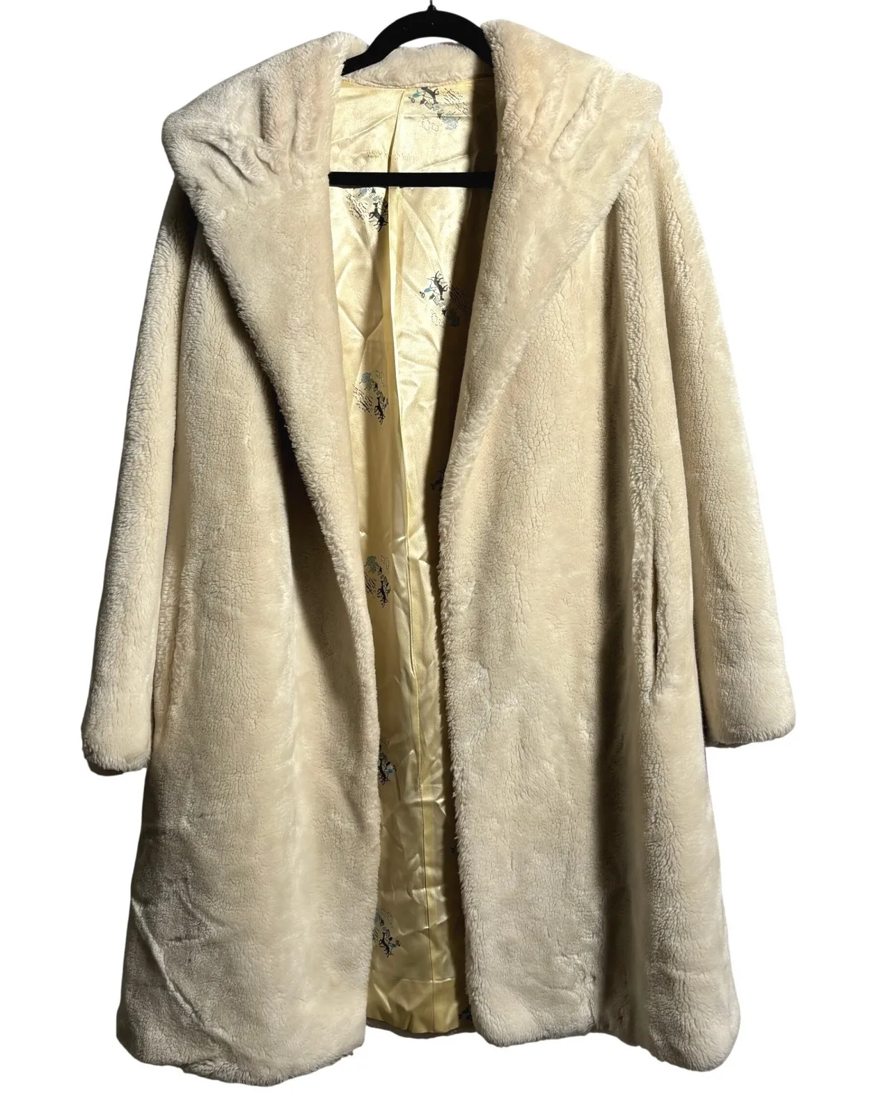 Measurements: • Chest across: 25 in • Length: 38 in Keywords: faux fur, vintage coat, hooded coat, winter fashion, retro style, cozy, plush, warm jacket, throwback, classic, outerwear vtg lined glamorous luxury luxurious teddy collared, pockets mob wife MCM mid century bridal winter bride gift for her classic retro ivory long heritage Some marks on faux fur. Please see photos for details. Offers welcome!