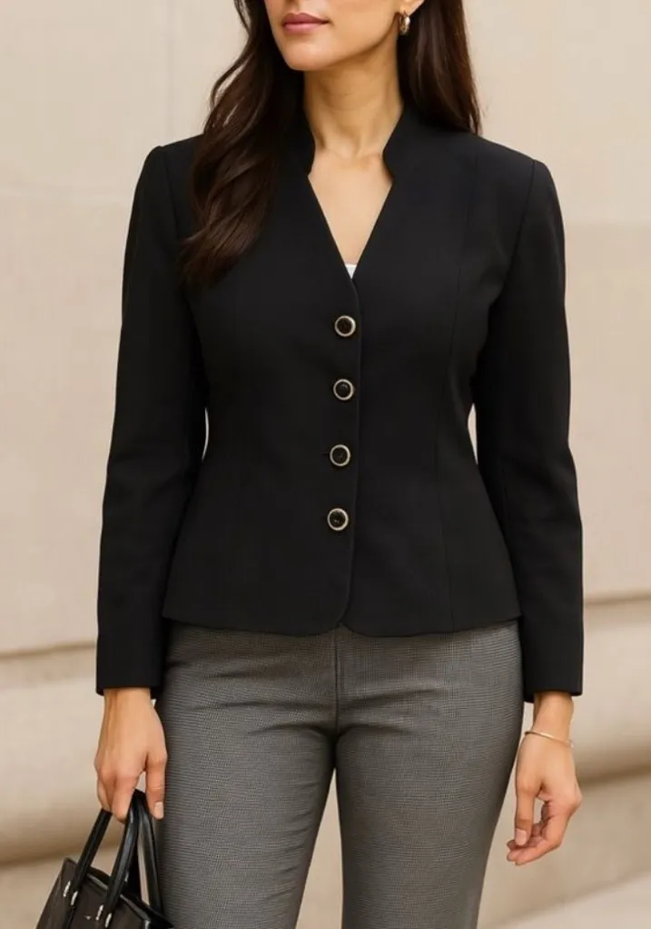 Vintage 2000s Drapers & Damons Women's Black Mandarin Collar Button Blazer sz 12P Same or Next Day Shipping! Sophisticated and modern, this tailored black blazer features a sleek V-neckline, structured long sleeves, and a flattering fitted silhouette accented with four metallic button closures, making it a polished choice for professional or evening wear. Great Preowned Condition!! Pit to pit 21" Bundle and Save!! 469 #OldMoney#Derby#Classical#Minimalist#Career Workwear office business corporate career fashion attire ensemble outfit layering statement trend essential neutral slim streamlined flattering sharp upscale executive sophisticated classic chic preppy academia timeless
