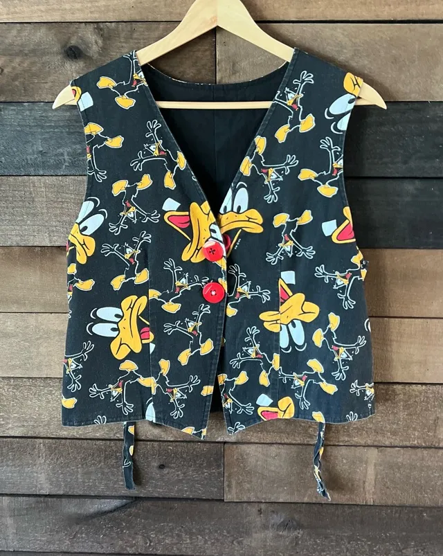 Tagged Size Not Shown Best Fits S–M Laying Flat Approximately: 18.5” ptp, 20.5” length Such a fun 90s Looney Tunes piece — a Daffy Duck allover print vest with bright red buttons and adjustable side ties. Easy to layer and perfect for adding a little personality to fall/winter outfits. Wear it over a fitted long sleeve tee, pair with high-waisted denim, or style with a mini skirt, tights, and boots for a playful, nostalgic look. This is a secondhand item and may show minor signs of wear consistent with age, adding character.