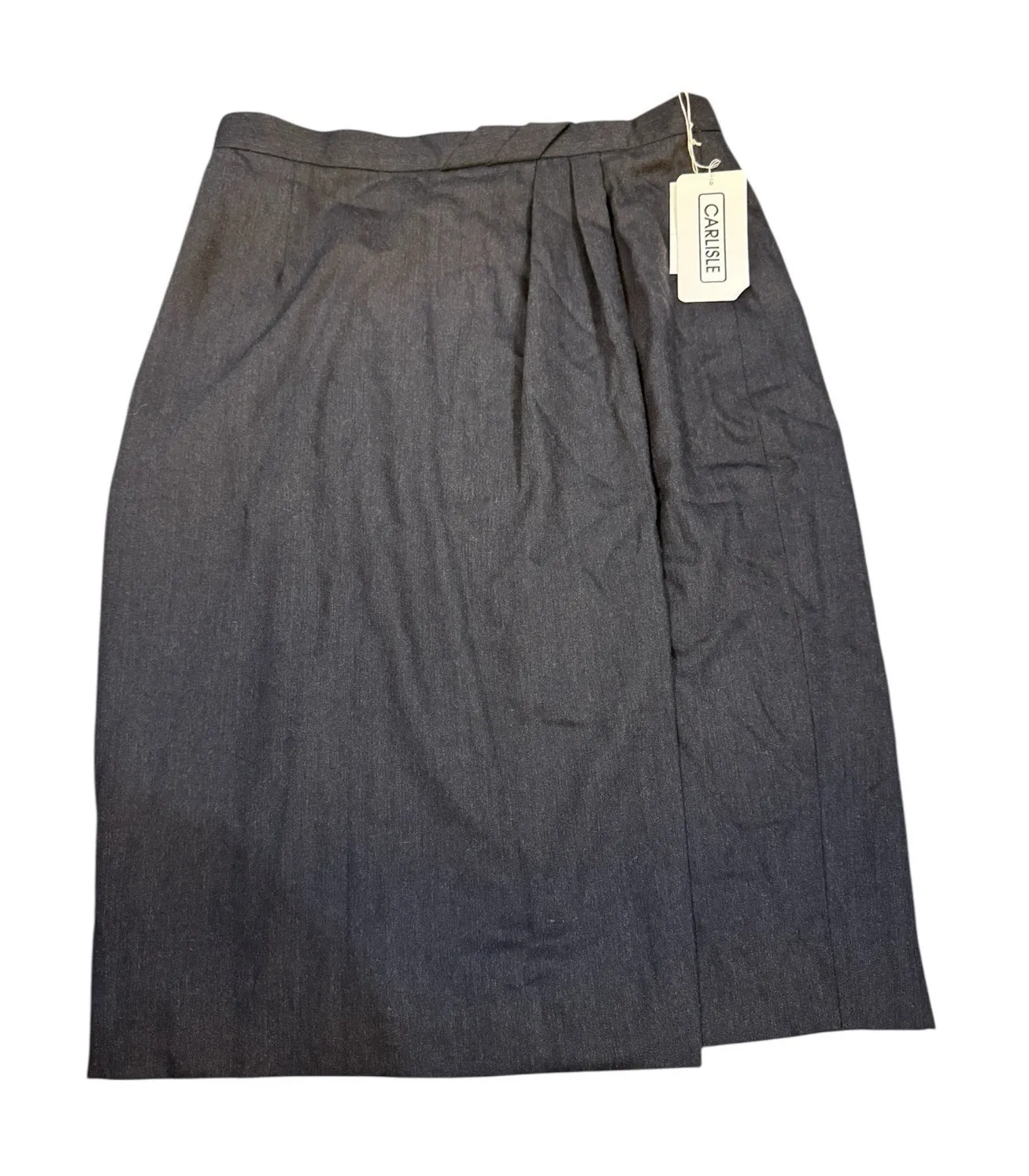 The Vintage Dead Stock Carlisle Wool Gray Pencil Midi Skirt in Size 16 is a stylish and unique piece of women's vintage clothing. Made from 100% wool, this faux wrap skirt exudes a retro 1990s charm with its secretary/ geek look. With its original design and grey color, this Carlisle skirt from Hong Kong is a stand-out addition to any wardrobe for those who appreciate vintage fashion. Couple of small imperfections in wool. Harder to notice because of lining. See photos. 2227. 6600. 010826
