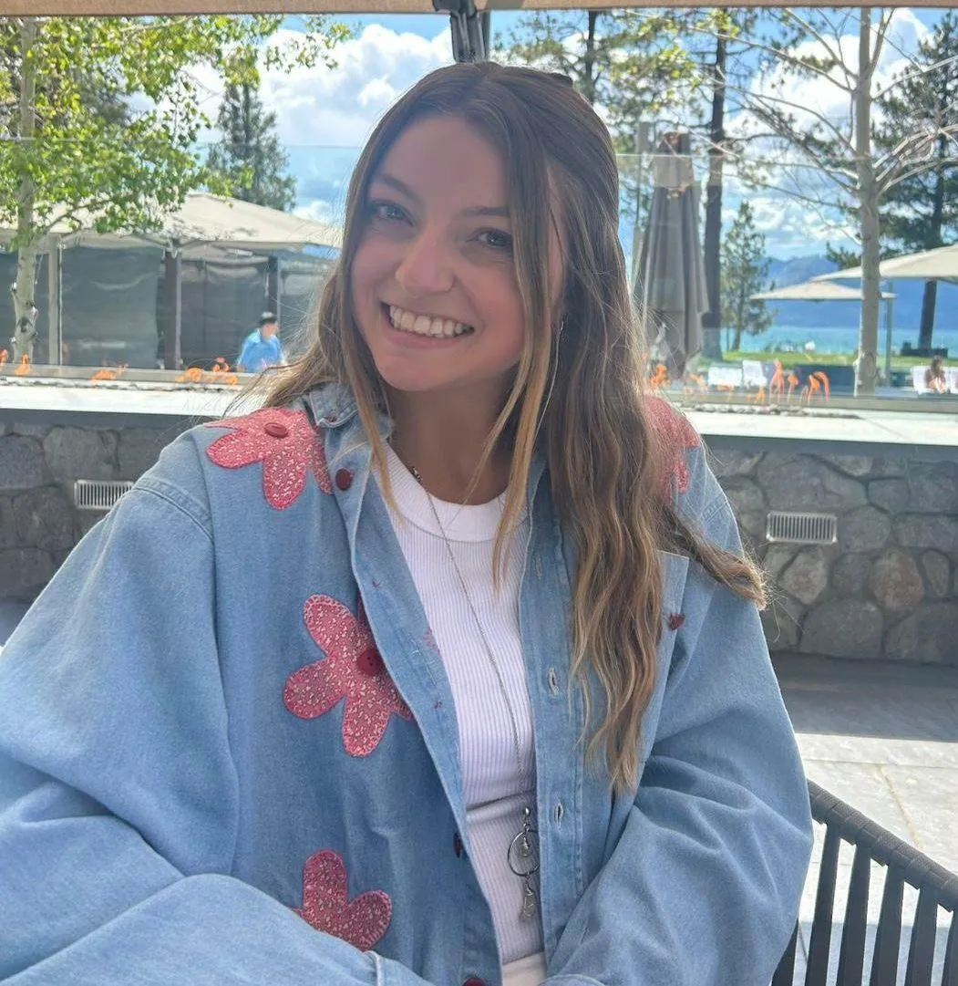 90’s or early 2000’s light blue denim button-up shirt with pink flower appliqués(?) and red buttons. 100% cotton. Labeled as a small and fits oversized - could fit up to a medium. #y2k #springfloral #90s #cottagecore #denimshirt