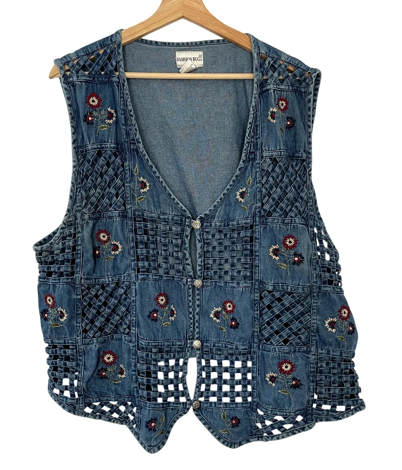 Add a touch of Y2K flair to your wardrobe with this vintage denim vest from Fashion Bug! This women's size L vest features a classic button-front design and beautiful embroidery, making it a unique and stylish piece. Made from comfortable and durable cotton denim. Perfect for layering or wearing on its own, this vest is a versatile addition to any outfit. Pair it with your favorite jeans, skirt, or dress for a fun and fashionable look. Features: - Brand: Fashion Bug - Style: Vest - Era: Y2K - Material: Cotton Denim - Size: Women's L - Closure: Button Front - Details: Embroidered This vest is in great vintage condition. Don't miss out on this awesome Y2K piece!