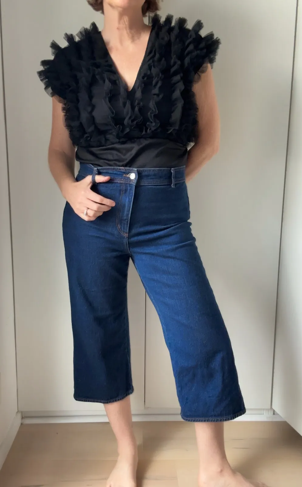 Give your wardrobe a true retro moment with these vintage dark-wash denim gaucho pants. With a wide,... Show more