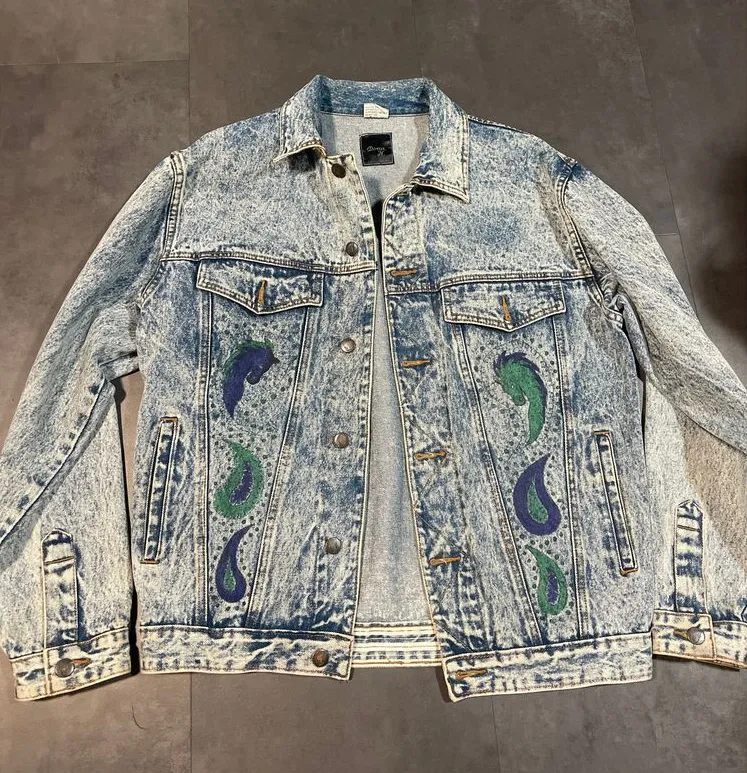 Step into the 90s with this eye-catching denim jacket! Featuring a unique acid wash and bold paisley print, this jacket is perfect for making a statement. Ideal for music festivals, retro parties, or adding an edgy touch to your everyday look. The oversized fit offers versatility - wear it as is for a relaxed vibe or size down for a snug fit. Stand out from the crowd and embrace vintage fashion with this one-of-a-kind piece! Keywords: vintage, denim jacket, H&M, acid wash, paisley print, 90s fashion, retro, oversized, festival wear, statement piece