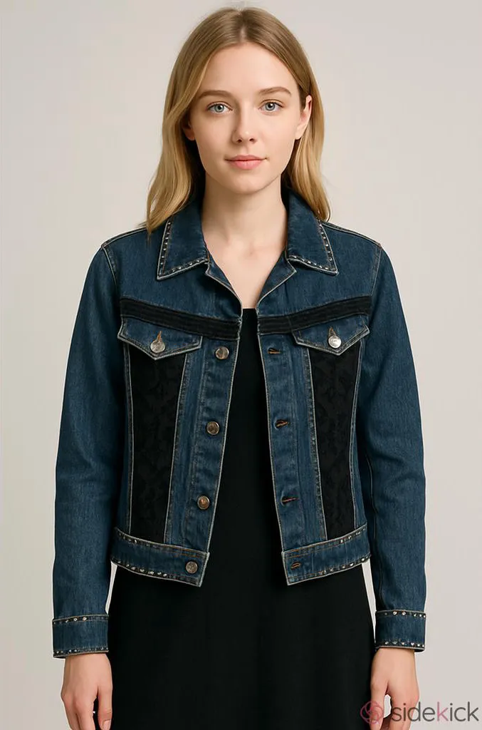 Elevate your style with this chic denim jacket featuring black lace accents and studded details. Per... Show more