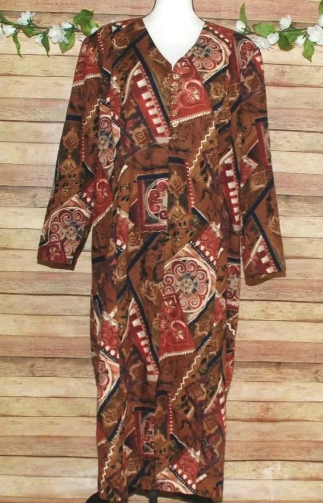 Step back in time with this vintage Diana Marco maxi dress. Featuring a stunning tribal print, it's perfect for any occasion. With long sleeves and a retro ethnic style, this dress is both unique and timeless. • Vintage Diana Marco maxi dress • Tribal print design • Long sleeves • Retro ethnic style • Brown color • Comfortable fit • Perfect for any occasion Please SEE measurements of the clothing items to insure fit! Measurements are in the last photo. To check measurements, measures a well fitting garment laying flat unstretched. We double the measurement for bust/chest/waist/hip/thigh and leg opening. Length is measured from shoulder to hem. Inseams are measured along the inseam. When you see TWO measurements for one area it is because the item has stretch and one is laying flat and the other is stretched. 🙂 Size: Womens 22 Condition: Pre-Owned Like New Great Condition Thanks for looking at my listing. I have been selling online for several years and take pride in the items that I am listing and feel they will make a great addition to someone's wardrobe or home. All the items I am listing have been checked by several people and do not have any flaws such as holes, rips, or stains. Any issues a piece may have will be disclosed and will be included in the photos.
