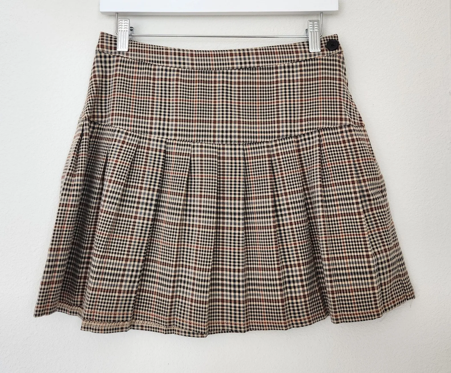 Pleated plaid mini skirt by Dickies in brown, black, orange. Preppy and classic silhouette, with side button and zipper closure. -beige, orange, and black plaid pattern -pleated construction -side button and zipper closure -mini length skirt -excellent condition -no visible flaws Tagged size 7, fits best as S 27 inch waist 43 inch hips 15.5 inch length (measurements are approximate) preppy dark academia plaid schoolgirl light academia vintage preppy indie cottagecore 90s aesthetic street style heritage skater girl classiccore