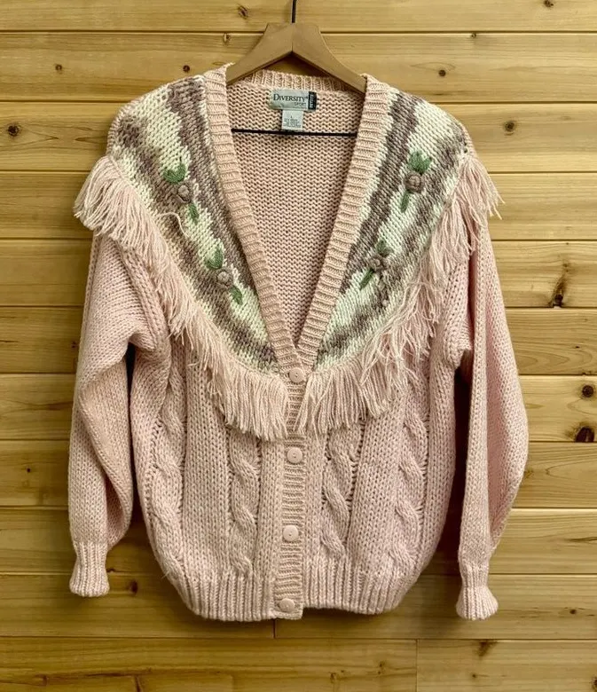 Vintage Diversity Size Large Coquette Girl Floral Fringe Baby Pink Cardigan - $45 - From Sadie