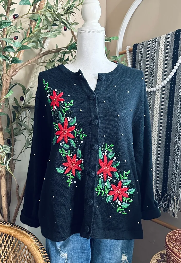 Vintage DonnKenny Black Pearl-Studded Embroidered Poinsettia Christmas Cardigan – Size Large Gorgeous vintage DonnKenny Christmas cardigan featuring detailed **embroidered poinsettias and greenery that run diagonally across the front. Black knit base with beautiful pearl accents, gold beaded details, and adorable pearl mistletoe embroidery on the wrist cuffs for an extra festive touch. Perfect for holiday parties, Christmas photos, or adding vintage charm to your winter wardrobe. **Details:** • Brand: DonnKenny • Size: Large • Color: Black with red poinsettia + green embroidery • Pearl and gold beaded accents throughout • Pearl mistletoe detail on cuffs • Button-front cardigan • Classic vintage holiday style **Condition:** Has a few slight signs of wear on one side (shown in photos) — light faded marks, not very noticeable when worn. Overall great vintage condition. **Keywords/Tags: vintage Christmas sweater, DonnKenny cardigan, holiday cardigan, poinsettia sweater, embellished Christmas top, pearl beaded cardigan, retro holiday fashion, festive knitwear, vintage winter clothing P2P: 22” Length 24”