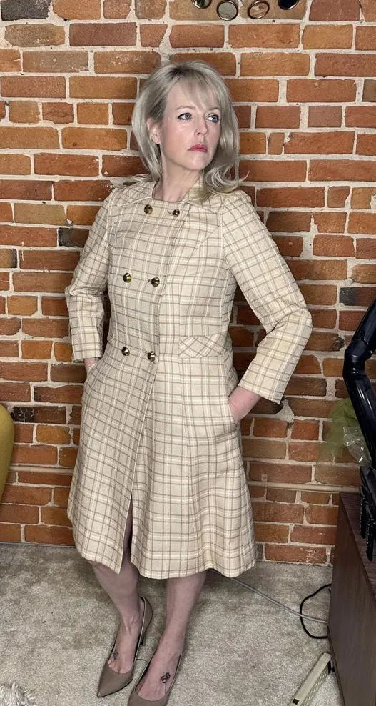 Step into the past with this vintage trench coat that screams, "I was cool before it was cool." It’s the fashion equivalent of a time machine, minus the flux capacitor. • Double-breasted closure • Belted waist • Gold buttons • Vintage style • Plaid pattern Small stain on the upper arm. Shoulder to shoulder = 17.25 inches Bust = 21 inches Waist = 24 inches Length = 39 inches