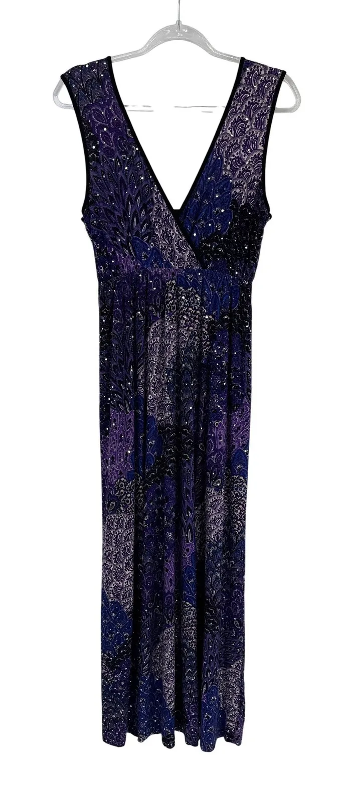 Capture attention with this stunning Dream Dance maxi dress. The vibrant purple and blue paisley print, adorned with subtle shimmering sequins, creates a captivating visual appeal. A flattering V-neckline and sleeveless design make this dress perfect for warmer weather, while the elasticized waist ensures a comfortable and shapely fit. The flowing maxi length adds an elegant touch, making it ideal for a beach vacation, a summer party, or a casual evening out. Style: Maxi, Wrap Dress, Sundress Dress Length: Long Department: Women Sleeve Length: Sleeveless Pattern: Paisley Occasion: Casual, Party/Cocktail Material: Polyester Blend, Spandex Blend Fabric Type: Jersey Theme: Bohemian, Tribal, Retro Neckline: V-Neck Season: Summer, Spring Sleeve Type: Strappy Sleeve Excellent preowned condition - no rips, stains, or tears. From a smoke free, pet friendly home. Approximate measurements in photos. Seller Notes: -Same/Next Business Day Shipping -Smoke Free & Pet Friendly Home Keywords: paisley print, sequined, sleeveless, V-neck, elastic waist, flowing, vacation wear, party dress, summer fashion, evening gown, boho chic, resort wear, USA made