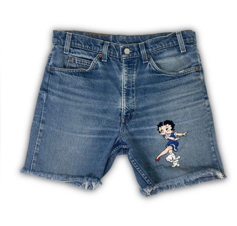 ✧.* tagged L 16.5” waist 12” front rise ✧.* extremely rare, licensed “TOO CUTE” vintage early 90’s betty boop jorts. dancing betty embroidered on front left, huge leather brand tag on back right waist. #bettyboop #jorts #90s #vintage