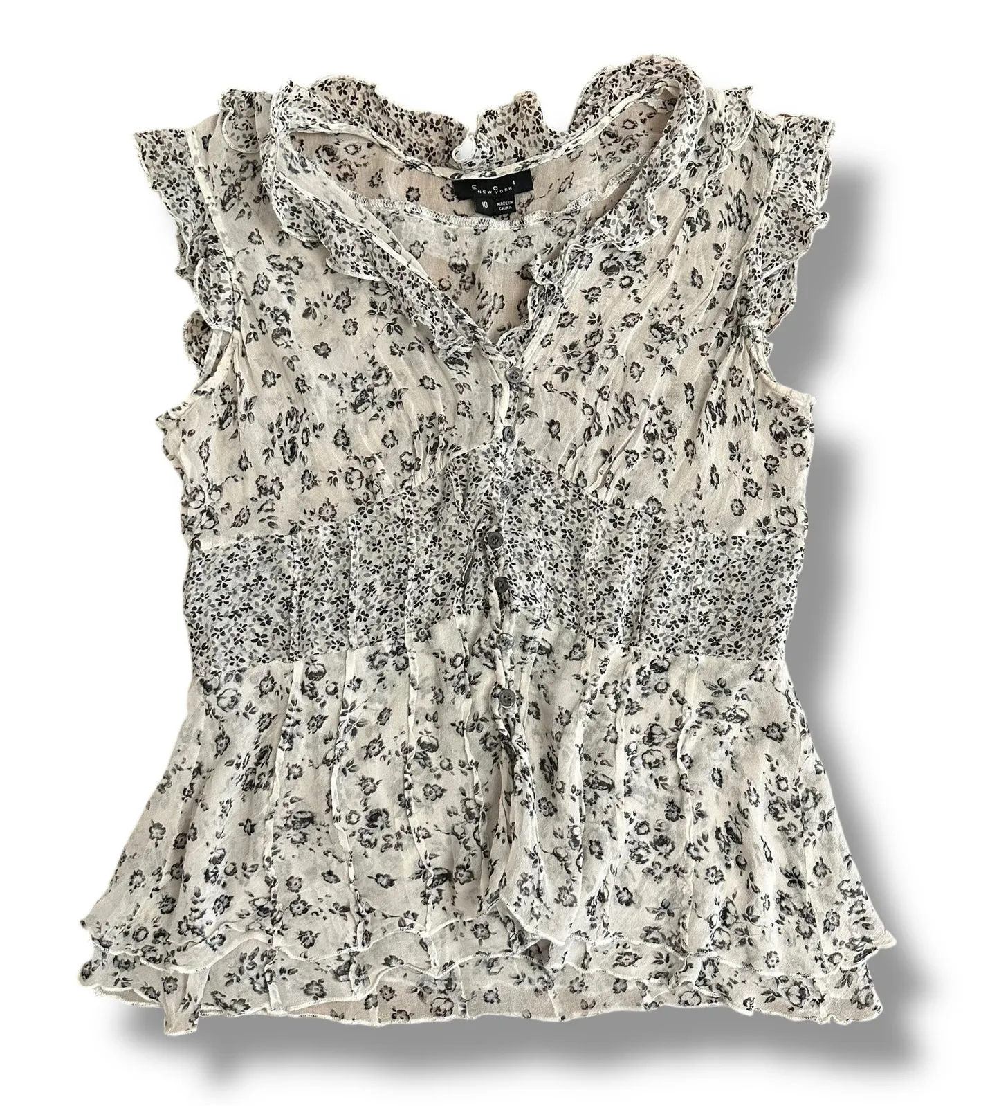 Soft, romantic, and feminine — this vintage ECI New York blouse features a sheer ivory base with delicate black floral print. Designed with ruffle trim, smocked waist, and button front details for a classic Y2K cottagecore look. ~ Size 10 | 100% Silk (Fabric content and care tag has been removed) | Measurements (Flat): Bust 16”, Length 22” | Hand Wash | Made in China | Condition: Excellent pre-owned. #eci #vintagetop #y2kfashion #cottagecore #ruffleblouse #romanticstyle #sheertop #vintageeci #floraltop ECI blouse, ECI New York, vintage ECI, Y2K blouse, floral ruffle top, cottagecore blouse, romantic blouse, sheer floral top, smocked waist blouse, feminine top, retro floral print, vintage romantic top, Y2K fashion, early 2000s blouse, lace trim blouse, romanticcore clothing, frill blouse, office feminine style, vintage sheer top, 00s revival, ruffle edge, button front floral top