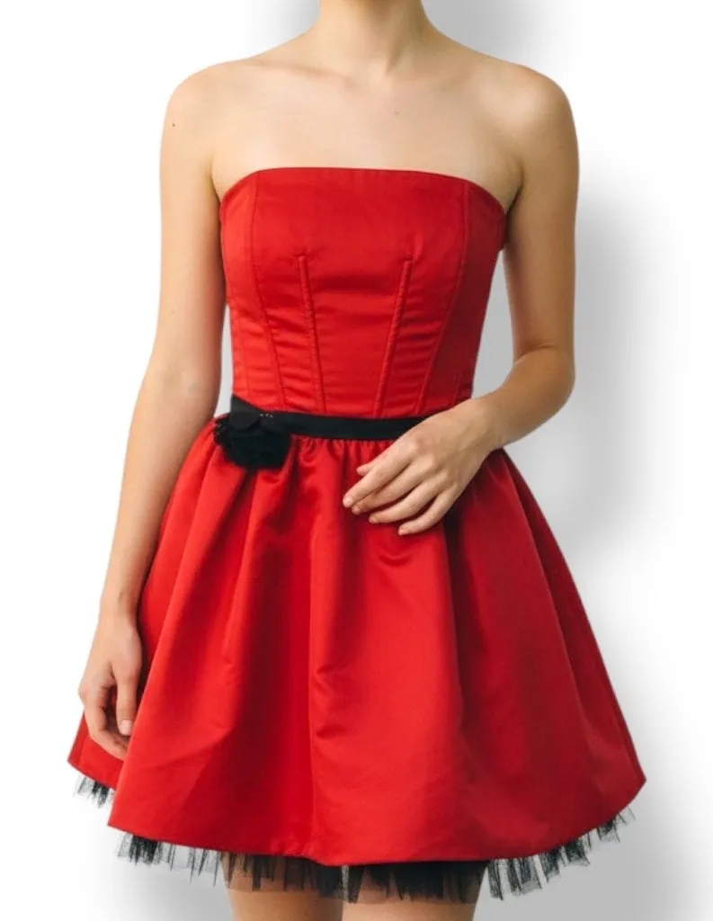 Vintage Eden Maids red strapless fit and flare mini dress Structured corset style bodice with shaping seams Black satin waistband with removable rosette accent Full flared skirt with black tulle trim hem Hidden back zipper closure Fully lined for structure and comfort Bridal party prom cocktail and holiday event wear Flat lay measurements 15.5 inches pit to pit 15 inch waist 18.5 inch hips 27.5 inch length Flirty romantic promcore with red hot pinup energy and playful movement