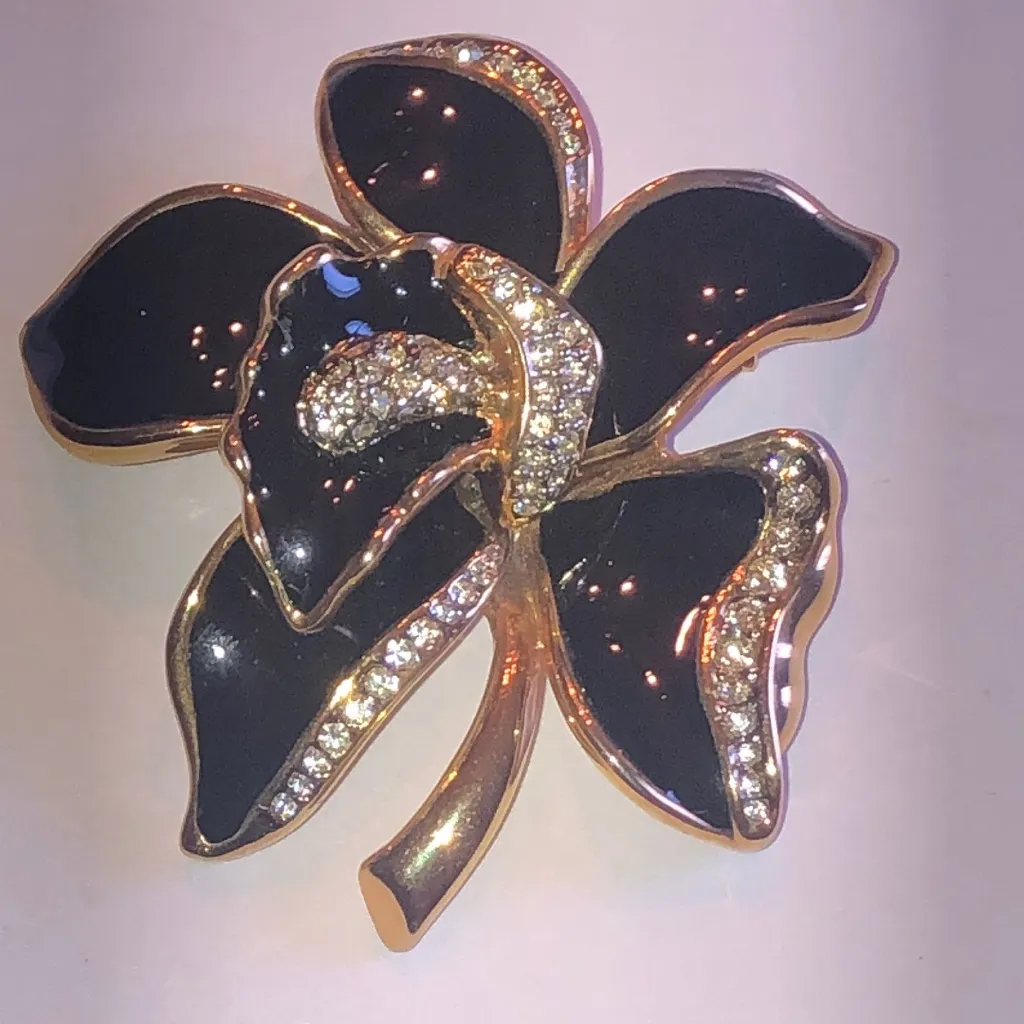 This stunning black and gold tone floral brooch adds a touch of elegance to any outfit. Perfect for special occasions or everyday wear. New without tags Approximately 2.25” S2 Boho Vintage Street Style Minimalist Statement Piece Essential Trendy Fashion Forward Must-Have On-Trend Cute Casual Edgy Classic Rare Find retro mid century modern estate jewelry costume jewelry