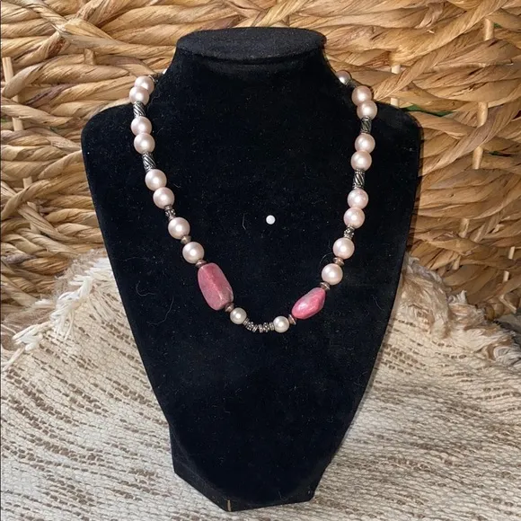 This elegant pink pearl with pink rhodonite stones necklace adds a touch of sophistication to any outfit. Perfect for special occasions or everyday wear. Rhodonite means compassion and love. Rhodonite is a stone of compassion, an emotional balancer that clears away emotional wounds and scars from the past, and that nurtures love. Pretty in pink, the Rhodonite Stone brings a flush of dark-hued shocking pink shades to light up your life. Looks like it has a bit of smoky quartz in the stones too.