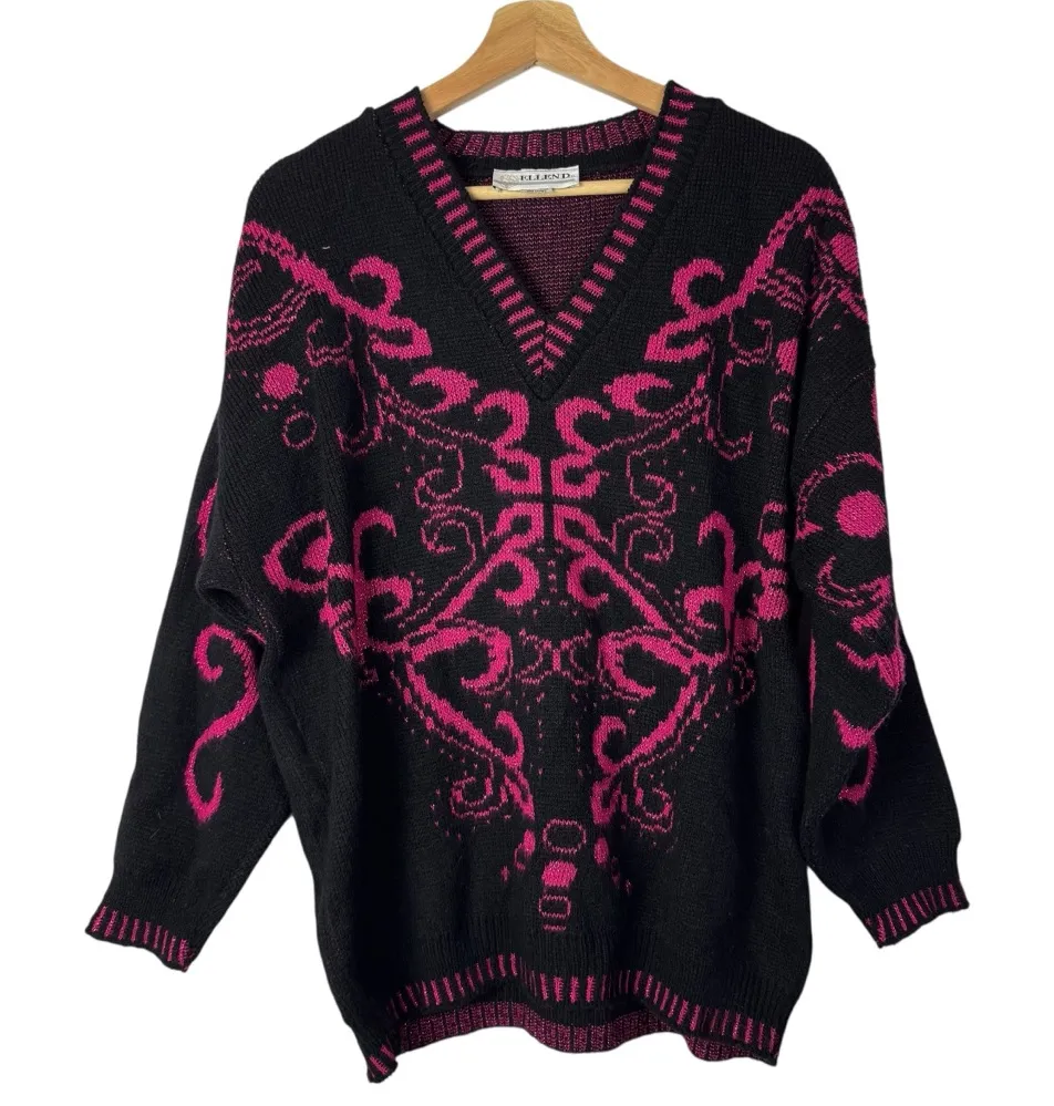 Vintage Ellen D Black & Hot Pink Knit V-Neck Sweater Good used condition, minimal signs of wear. - Black backing - Hot pink embroidery - Long sleeves - V-Neck neckline - Pullover closure - Knit feel material - Geometric printed - Drop shoulder sleeves - 75% acrylic 25% lurex All items ship from a smoke & pet free environment. All orders ship same or next business day.