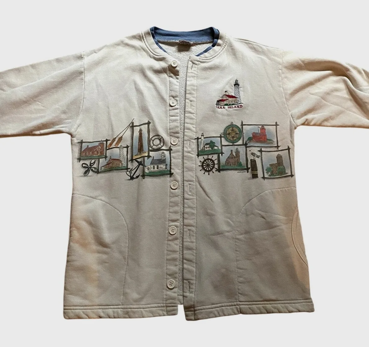 Vintage Embroidered Cana Island Long Sleeve White Button Cardigan Large Coastal ABC Designs vintage 2000 / 1990s white long sleeve cozy cotton button-up cardigan sweater. Size large. Embroidered lighthouse and cottage design with patchwork style graphics of seagulls, compasses, lighthouses, cottages, anchor, paddle, oars, etc. Blue rimmed collar. Crewneck style. In gently used condition, there is some light staining/discoloration as seen in pics. Pair with cozy baggy pants and chelsea boots for a new england granola girl look. Ships fast, highly rated seller! #granola #gorpcore #grannycore #grandma #newengland #maine #fisherman #grandpa #90s cozy minimalist, layering, holiday #heritage