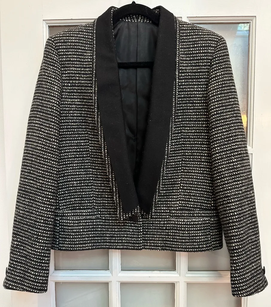 This chic women's jacket features a sophisticated black and off white design, perfect for any occasion. Its elegant style adds a touch of class to your wardrobe. Great, preowned condition, no found flaws Smoke free home