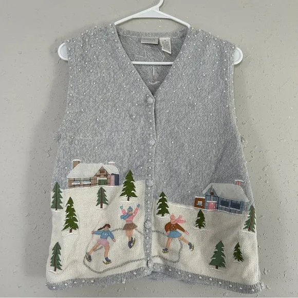 Erika Vintage Grey Pearl Ice Skating Winter Holiday Ugly Christmas Sweater Vest Size M - $35 - From Ellie