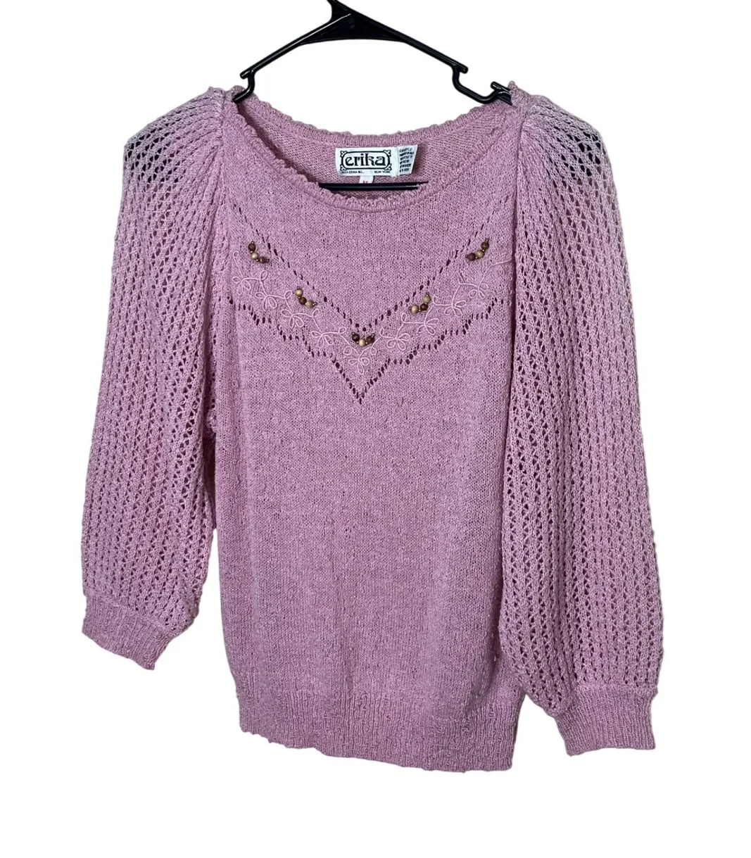 A charming pink textured knit sweater with delicate beaded floral accents. This sweater features a V-shaped pattern on the front yoke adorned with small, round wooden beads and intricate embroidered floral motifs. The sleeves are designed with a textured open-knit pattern, creating a stylish puff sleeve effect that tapers to a ribbed cuff. The neckline and hemline also feature a subtle textured trim. Style: Pullover Material: Acrylic Neckline: Round Neck Theme: Boho, Retro, Flower Type: Sweater Sleeve Length: 3/4 Sleeve Features: Lightweight, Stretch Pattern: Floral Fabric Type: Knit Accents: Beaded, Embroidered Keywords: vintage, textured, beaded, floral, knitwear, boho, feminine, retro !!!Please See Measurements vintage sizes run smaller than modern sizes!!! Measurements Length: 23 1/2 in Pit to Pit: 17 1/2 in Arm Length: 21 1/2 in