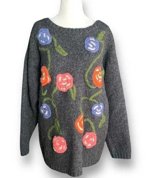 Vintage Esprit Wool Floral Embroidered Sweater • Oversized Esprit Vintage Wool Sweater With Floral Embroidery • Charcoal Gray Base With Red Pink And Blue Embroidered Flowers • Long Sleeve With Crewneck Silhouette • Feels Like Wool Or A Wool Blend Flat Lay Measurements 24.5 Inches pit to pit 26.5 inch length Style Tags: Vintage Embroidered Wool Warm Chunky Floral Cozy 90s Winter Layering Transitional Statement Sweater