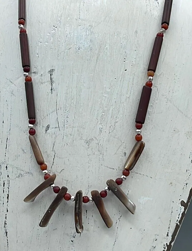 Vintage ethnic boho handmade mother or pearl wood necklace. Spring clasp. Long tube wooden , red glass silver colored and mother of pearl beads. Some finish off the tiny silver spacer beads.