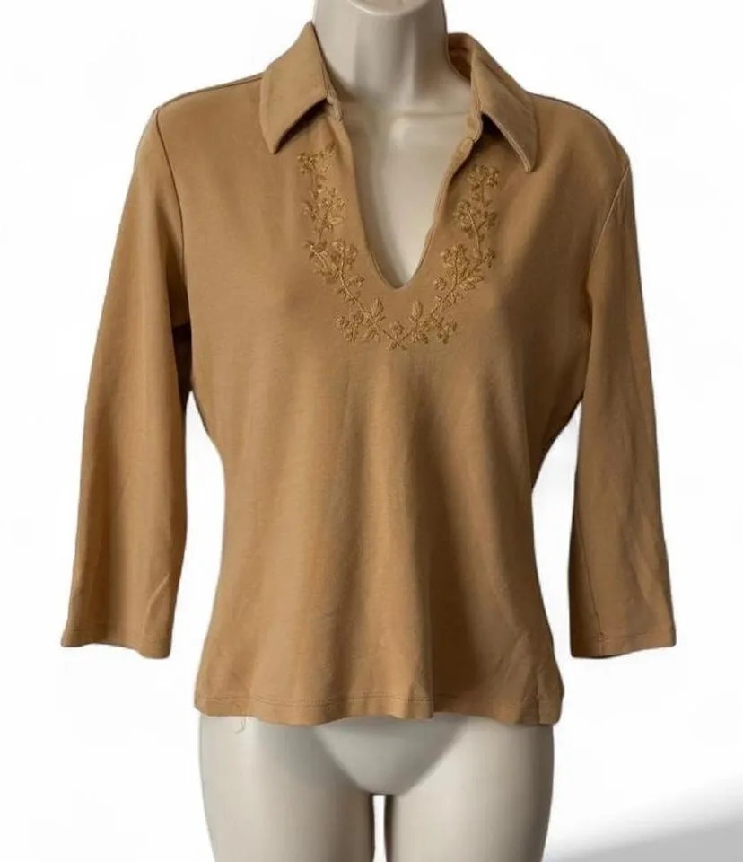 . Tan with 3/4 sleeves features collar and tonal embroidered neckline #retro #vintage #fairycore #em... Show more