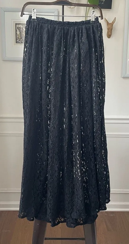 Vintage 80s Express Tricot sheer black lace midi skirt. Elastic waist measures 11 inches straight ac... Show more