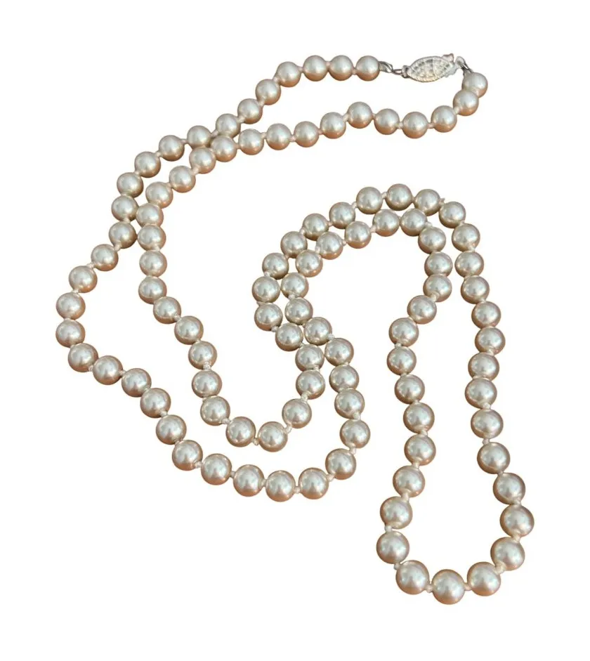 Elegant vintage faux champagne pearl necklace featuring a sterling silver hook clasp. Perfect for adding a touch of sophistication to any outfit. Estate piece measuring 29 inches in length, timeless and versatile. • Vintage design • Faux champagne pearls • Sterling silver hook clasp • Estate piece • 29 inches long Excellent preowned condition