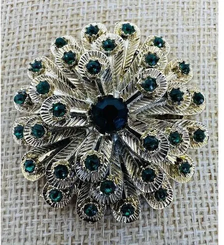Vintage Feather Peacock Emerald Green Flower Pin Brooch Rhinestone Gold Tone. Pre-owned. In good working condition. No missing rhinestones. Shows wear throughout. Please see all photos.