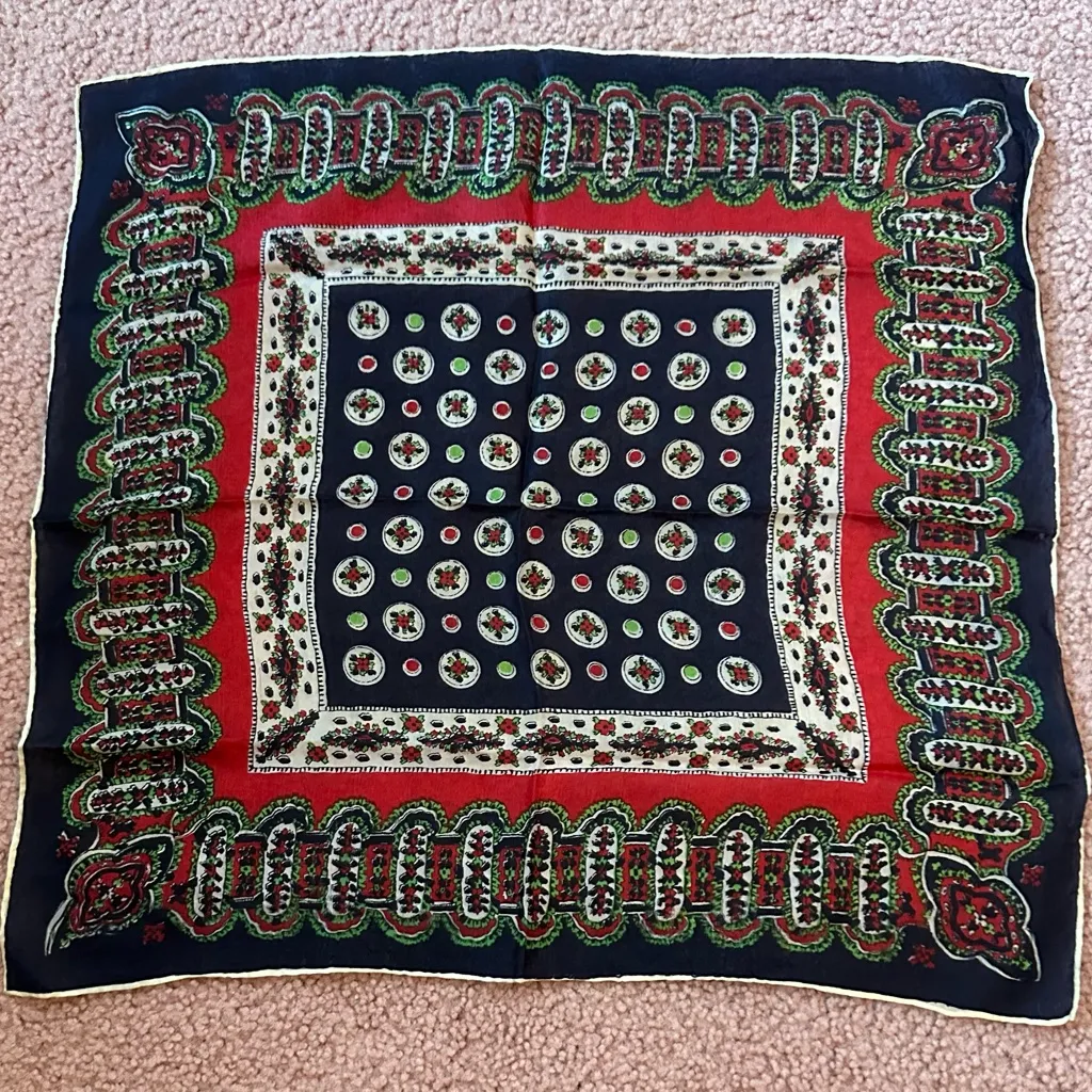 Vintage Feels Like 100% Silk Hand Rolled Scarf Smells Must/Perfume No Tags Navy Blue See photos for dimensions. This scarf has not been cleaned. No visible defects. It smells musty and like perfume. Dry clean or hand wash.