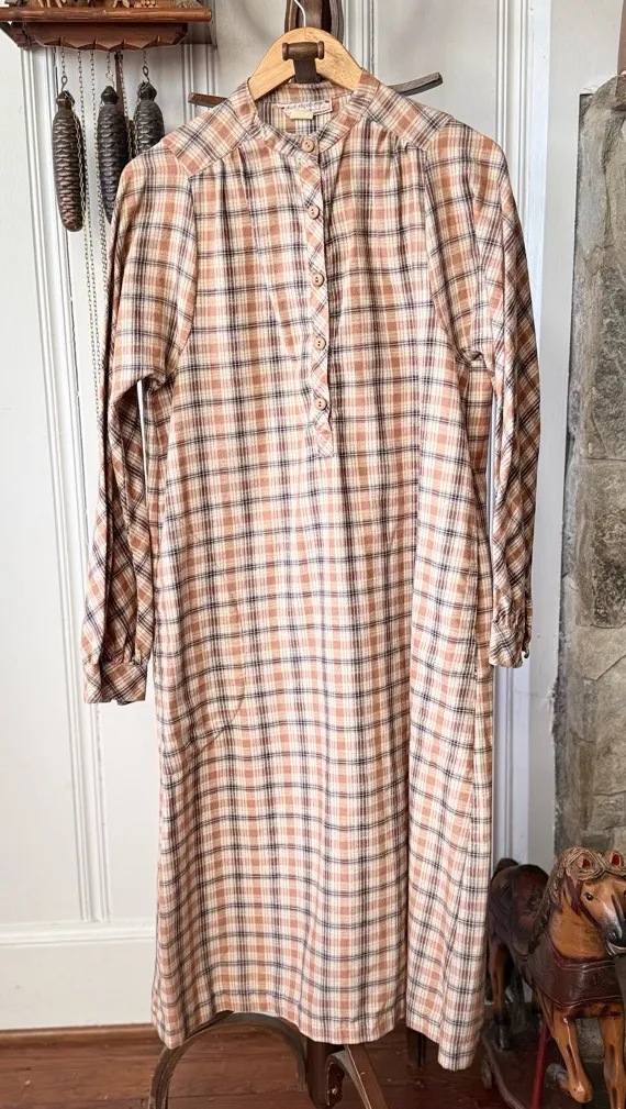 By Aunt Abigails Attic ; Exclusive Country Clothes Labeled size large Would look great with a brown leather waist belt! Ralph Lauren vibes. 100% cotton Has pockets! Band collar, gathered seams, buttons down to waist. Has a small hole near back collar, otherwise no flaws! 22.5” ptp 47” length Tags: neutral natural fibers winter