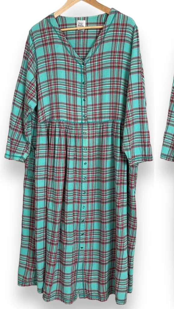 Vintage 90s plaid flannel nightgown with green pearl snap buttons down the front. Long sleeves, V-neck, front pockets. Color is a turquoise / greenish blue. Brand: Only Necessities Condition: Preloved vintage with wash wear, pilling, wear on the button color, and pulls on the seam stitches - see close-ups. Size: 1X. See approximate measurements for best fit. Pit to pit: 24" Across waist: 24" Length: 48" Cleaned and from a smoke-free home. Fast shipper!