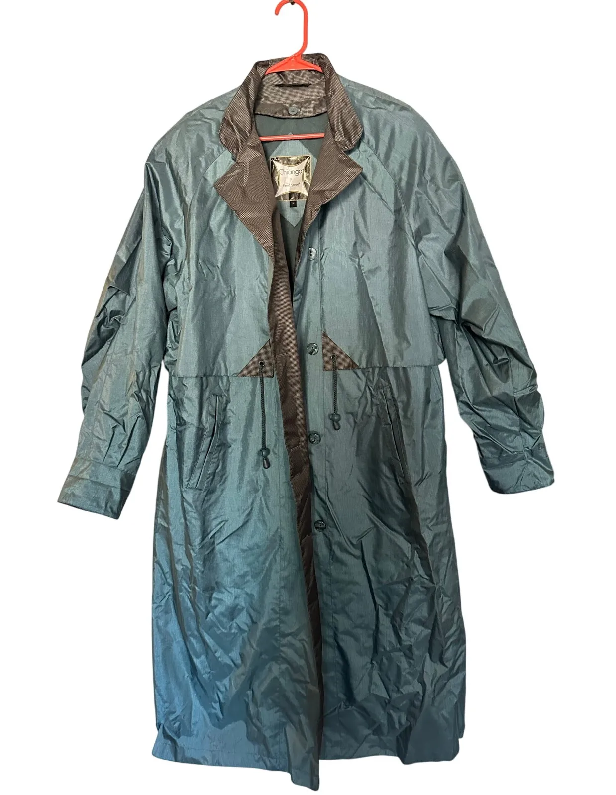 Vintage FLEET STREET Blue Button Up Gingham Accents Long Trench Rain Coat size 12 Size: 12 Color: Blue Condition: Preowned in good condition Features: Silvery-blue color Shoulder pads Rubberized, water resistant Lined with 100% nylon Gingham detail inside liner Button Up Adjustable Waist Perfection rain jacket Liquid color blue Front pockets