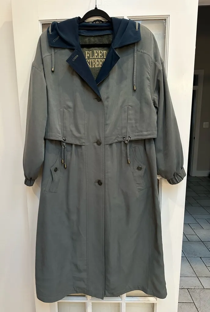Elevate your wardrobe with this stylish green gray trench coat. Featuring a comfortable hood, it's perfect for any weather. Excellent preowned condition, no flaws Detachable wool blend lining Impeccable condition women’s size 10 Smoke free home