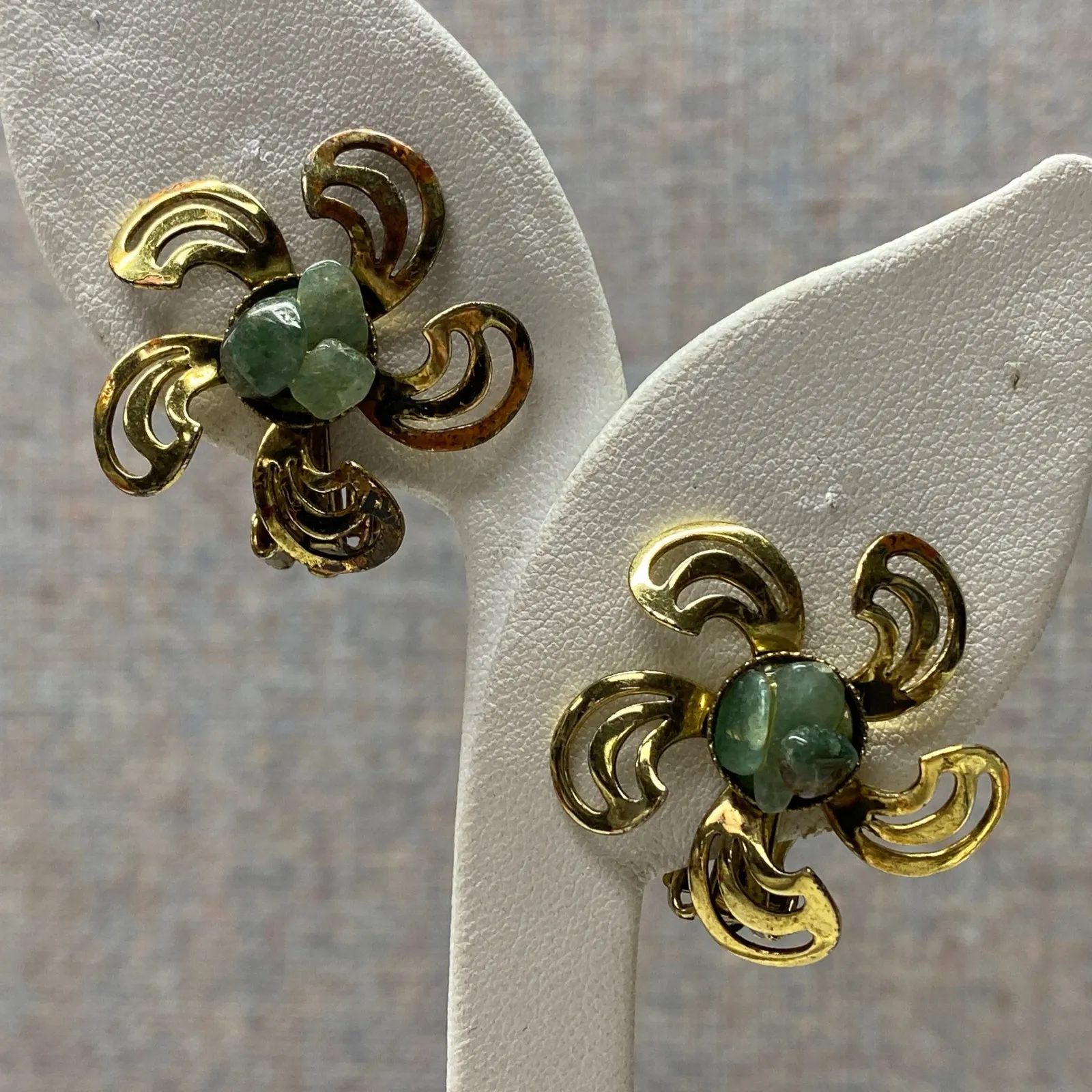 Preloved in excellent condition Please see all photos for close up details and measurement. Style: Dangle/Drop Main Stone Color: Green Closure: Clip-On Theme: Bohemian Main Stone: Amazonite Metal: Brass Shape: Flower Material: Stone Type: Earrings Main Stone Creation: Natural Main Stone Shape: Chip Setting Style: Bezel Ear Area: Lobe Keywords: vintage jewelry, floral earrings, green stone, gold tone, clip on, raw stone, unique, statement earrings, artisanal, garden party, brunch, everyday elegance, retro