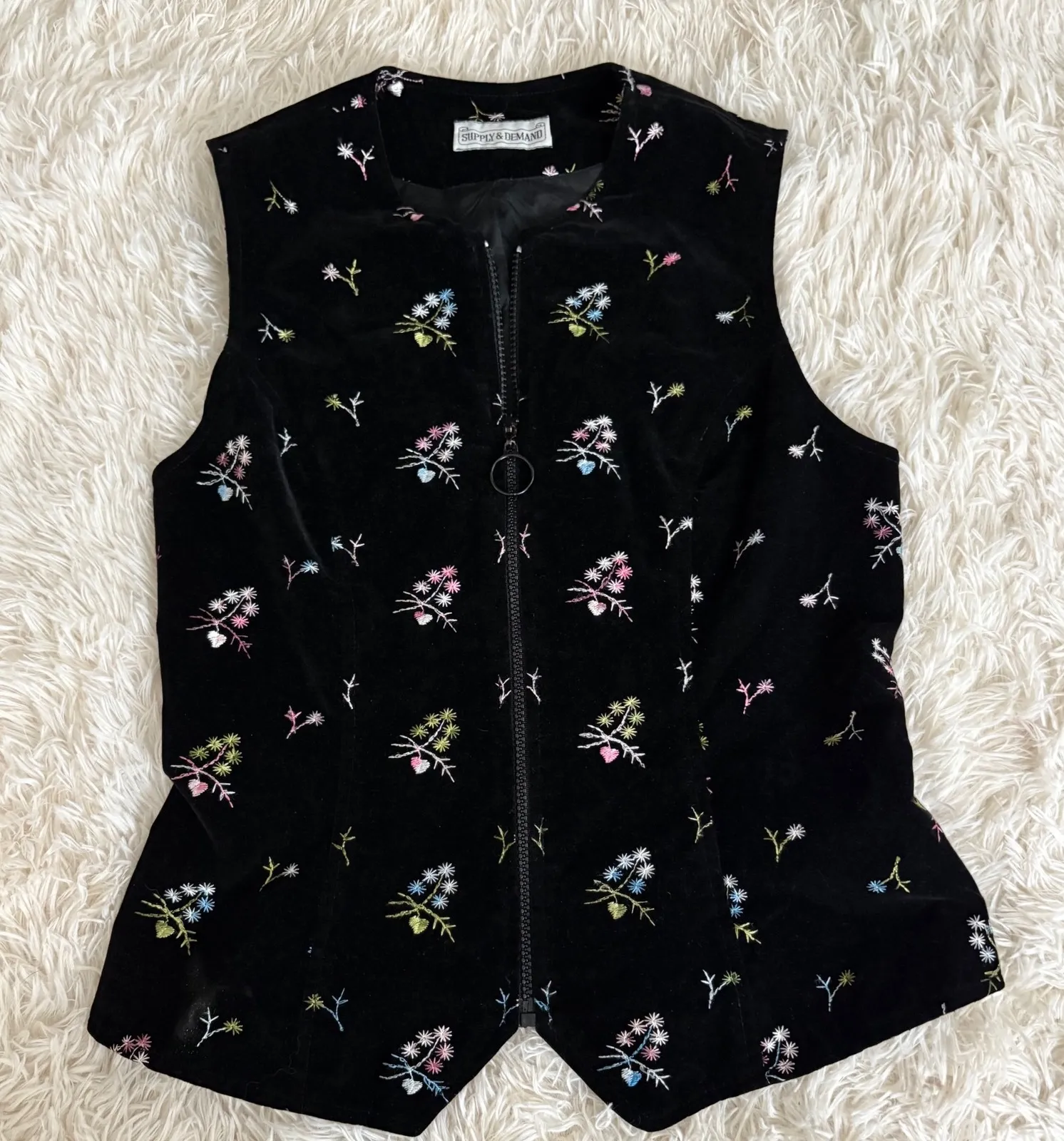 Elevate your wardrobe with this charming vintage vest, a delightful piece that adds a touch of retro flair to any outfit. Intricate floral embroidery dances across a sleek black background, creating a visually stunning display of delicate blooms. The vest features a flattering sleeveless design and a full zipper closure for easy wear, while its soft velvet texture invites tactile exploration. Perfect for layering over a crisp white blouse or styling with a bohemian-inspired dress, this vest is your secret weapon for creating unforgettable looks. Imagine wearing it to a casual brunch with friends, a weekend music festival, or a stylish evening out. Measurements: • Length: 22 inches • Width: 16 inches Cwoman Decade: 1990s Look: Boho Size (Women's): XS Material: Velvet Style: Shirt Keywords: vintage vest, floral vest, embroidered vest, velvet vest, sleeveless top, black vest, retro vest, Y2K vest, Supply & Demand, women's vest, festival fashion, bohemian style, layering piece, unique vest, floral embroidery