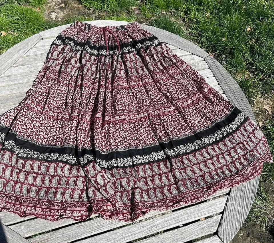 Vintage floral and paisley fairy skirt by Huntington Ridge size large. Good condition has small stain near bottom. Beautiful burgundy black and cream color. 100% cotton has elastic and drawstring and waistband. 15 inch waist, 35 inches top to bottom. Ships in one to three days.🎉 Boho fairy hippie whimsy summer spring