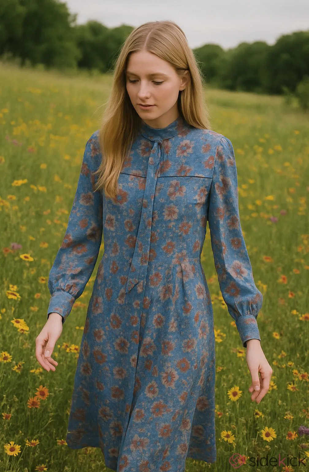 Step back in time with this floral prairie dress. Featuring a high neckline with built in tie, optio... Show more