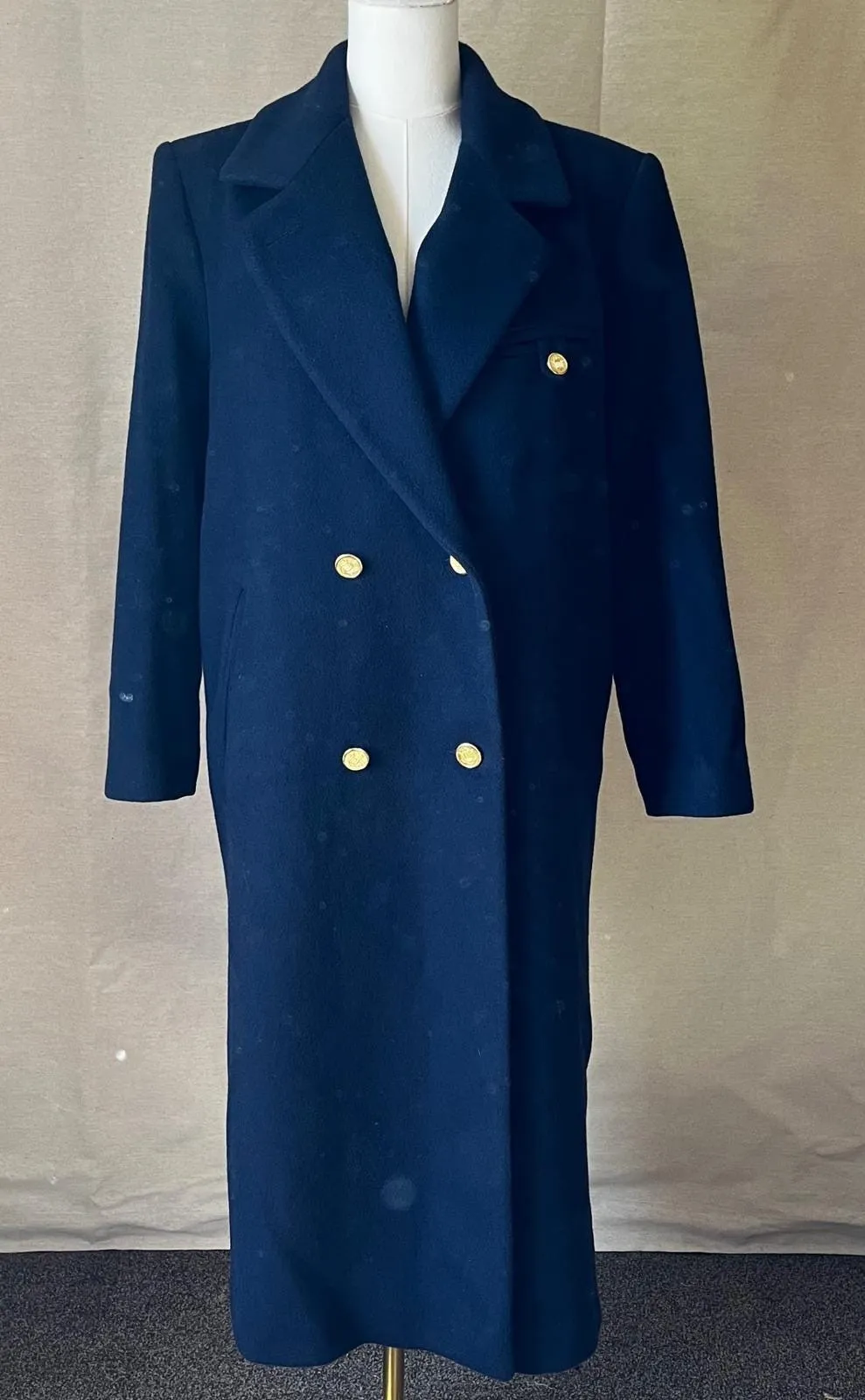 // Please check measurements before purchasing Classic and refined vintage Forecaster of Boston coat made in the USA from pure wool. Features a rich navy hue, double breasted design, and embossed gold tone crest buttons for a timeless military inspired look. Fully lined with structured shoulders and a long tailored silhouette — a beautiful example of high quality American craftsmanship from the late 80s–early 90s era. DESIGNER: Forecaster of Boston -union tag SIZE: 7/8 MATERIAL: 100% Pure Wool CONDITION: Excellent vintage, clean lining, buttons intact. MEASUREMENTS (approx.) Pit to Pit 22" Waist 23" Length 43" Shoulder to shoulder 17" Sleeve length 22.5" (X061) Vintage navy wool coat, 1980s American coat, Forecaster of Boston outerwear, long double breasted coat, gold button military coat, minimalist navy overcoat, timeless winter outerwear, classic wool trench style.