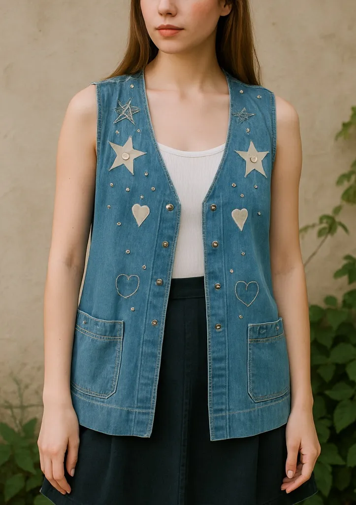 Super cute vintage denim vest by Fran’s (Dallas, Texas) featuring embroidered stars, hearts, and silver-tone studs for a true 90s Western–boho vibe. Button-front style with large front pockets and a relaxed, easy fit (PTP 20”). Perfect for layering over tees, dresses, or skirts for a unique retro look. Has a very small paint/stain spot on one side — not noticeable when worn. Overall great pre-owned condition. Details: • Brand: Fran’s (Dallas, Texas) • Size: Approximately M/L (PTP 20”) • Features: Star & heart appliqué, studs, button front, large pockets • Era: 90s • Condition: Good vintage condition • Minor flaw: Small faint spot (not noticeable) vintage denim vest, 90s vest, star appliqué, heart appliqué, boho western, retro denim, festival outfit, grunge layering, y2k denim, cottagecore denim, embroidered vest, Fran’s Dallas