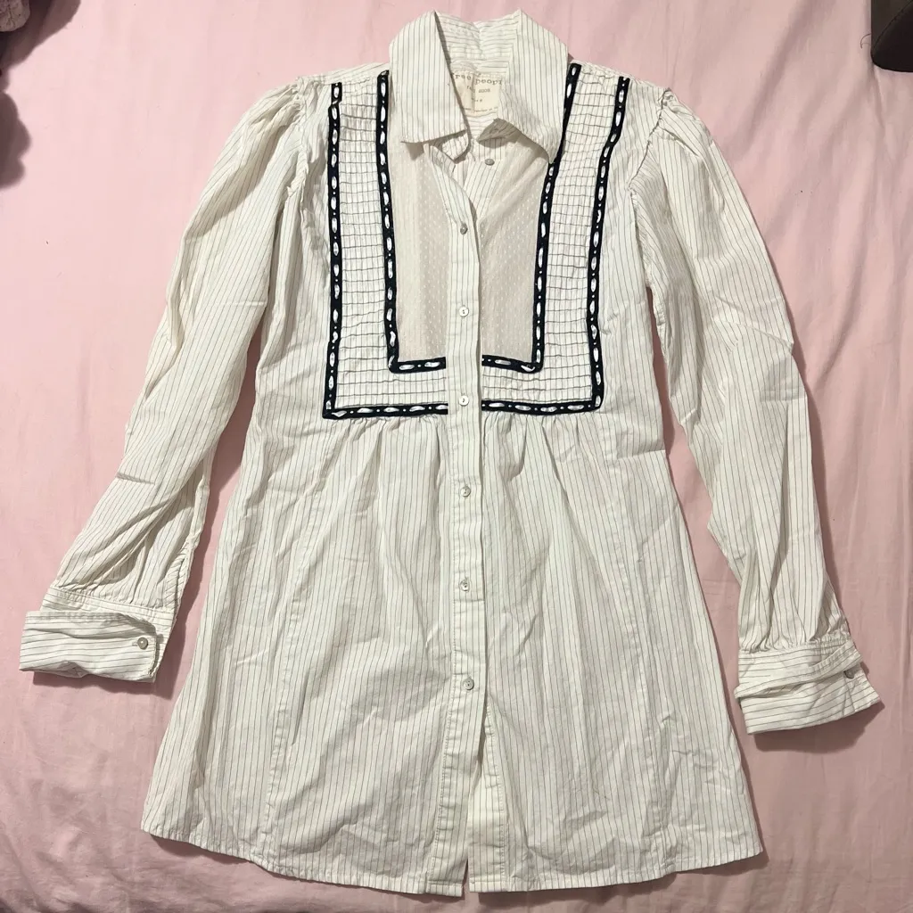 Stylish white striped shirt with black trim. Features long sleeves and button-up front. Pretty goo... Show more