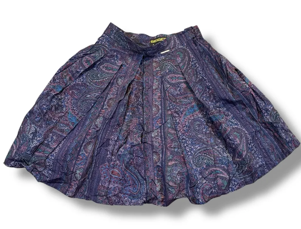 Size 36, but fits like a size small. Please see all measurements in photos to ensure the proper fit for you! This skirt has been lightly worn but is in great vintage condition! The only flaw I noticed is a small tear by the zipper and top hem. It is not terribly noticeable but please see all photos! This skirt is a vintage gem! It is in an all over paisley print in dark shades of purple and blue, pleated details, and is constructed of wool. There is a lining underneath and a zipper closure on the side with a button. It also has pockets and the cutest small metal "Geiger" logo underneath the top hem! - L7-102 8 oz