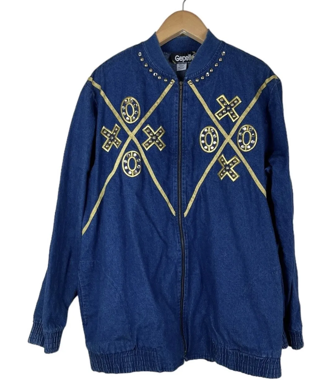 This is a vintage denim jacket from Gepetto in a women’s size large. This jacket does have a mark by... Show more