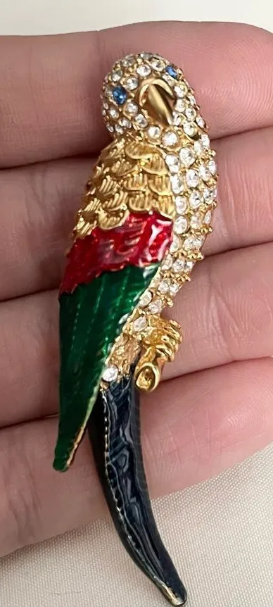 Vintage Giorgio Rhinestone Parrot Brooch Enamel Gold Bird Pin Statement Costume Jewelry Yellow gold plated parrot bird with Rhinestone crystal body and enamel wings. Signed โGiorgioโ Vintage brooch, parrot pin, enamel bird jewelry, statement brooch, rhinestone parrot, Giorgio brooch, mid century costume jewelry, retro enamel pin, gift for bird lover, signed vintage jewelry Approximately 3โ long Gently used, no flaws ๐ ๐ฟ ๐ ๐ฟ ๐ ๐ฟ ๐ ๐ฟ ๐ F L O W E R S F O R O L I V E R