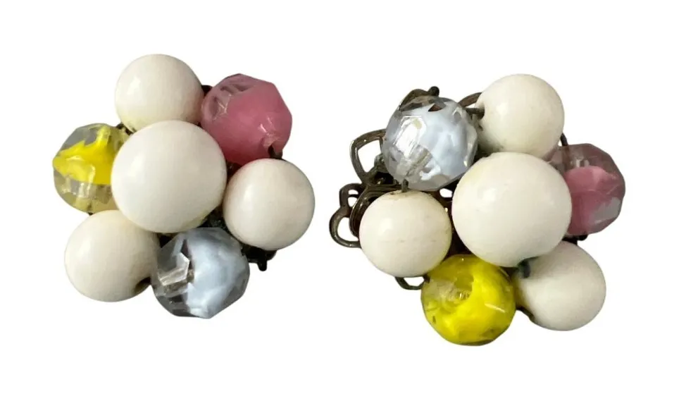 Elegant vintage glass bead cluster earrings in a silver tone with white and yellow accents. Perfect for adding a touch of retro charm to any outfit. Estate find in excellent condition with classic clip-on style. • Vintage glass bead design • Clip-on style • Silver tone finish • White and yellow accents • Estate find • Classic retro look Measure approx. 1" across Weigh 14.99g Great preowned condition