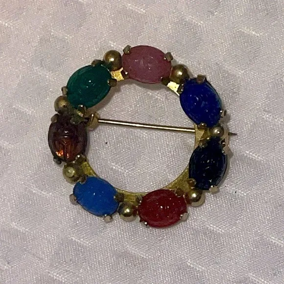 VINTAGE GLASS BEAD SCARAB BEETLE EGYPTIAN REVIVAL 1.25" BROOCH PIN ART Gold - $12 - From Amanadyunique