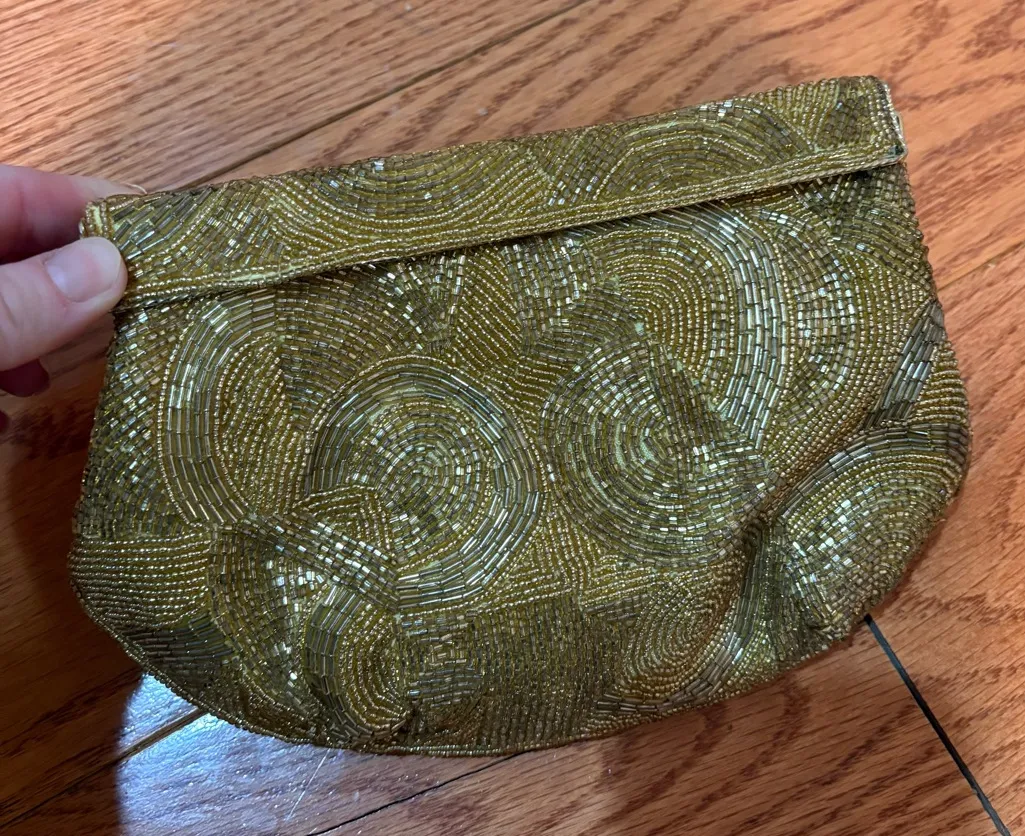Elegant vintage gold beaded evening clutch, perfect for weddings, formal events, cocktail parties, and special occasions. Features intricate swirling beadwork throughout with a beautiful satin yellow interior lining. • Vintage beaded exterior with ornate swirl pattern • Gold tone beading and trim • Satin yellow interior • Originally included a shoulder chain (chain is broken) • Designed to be worn as a clutch — flaw is not noticeable when carried • Structured shape with timeless vintage appeal • Fits essentials like phone, cards, and lipstick Condition: Excellent vintage condition. Beading is intact and gorgeous. Shoulder chain is broken but does not affect use as a clutch (see photos). A stunning statement accessory for formalwear, weddings, or vintage-inspired looks. 📦 Ships fast from a smoke-free home! 🎁 Bundle & save on shipping! #vintagebag #beadedclutch #eveningbag #weddingclutch #formalaccessories #vintagefashion #goldbag #cocktailclutch #vintagepurse